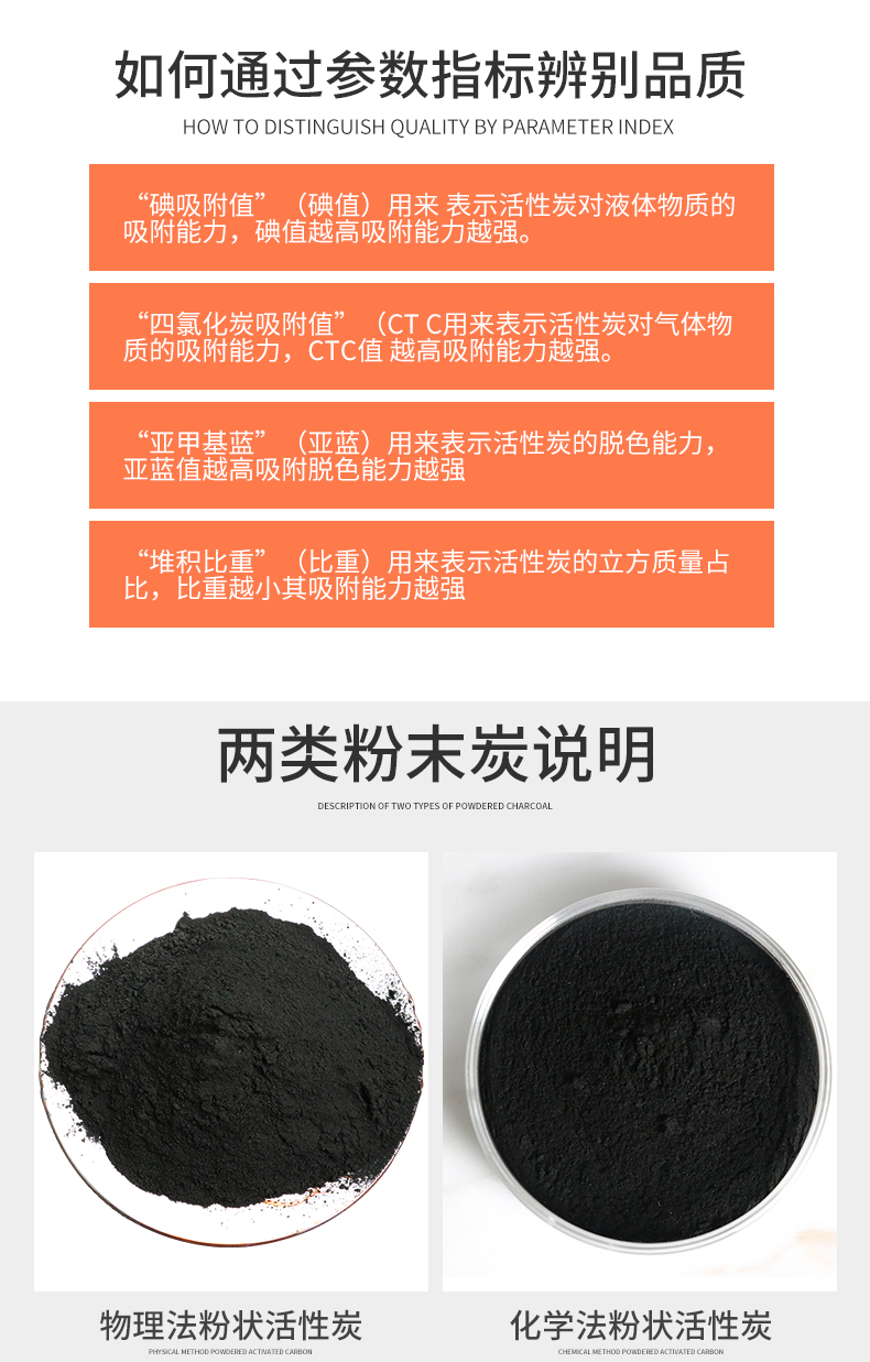 煤質粉狀活性炭的質量有多項物理與化學的指標,主要的如:水分、灰分、酸溶物、各種金屬和酸根的含量,以及它的吸附性能等。