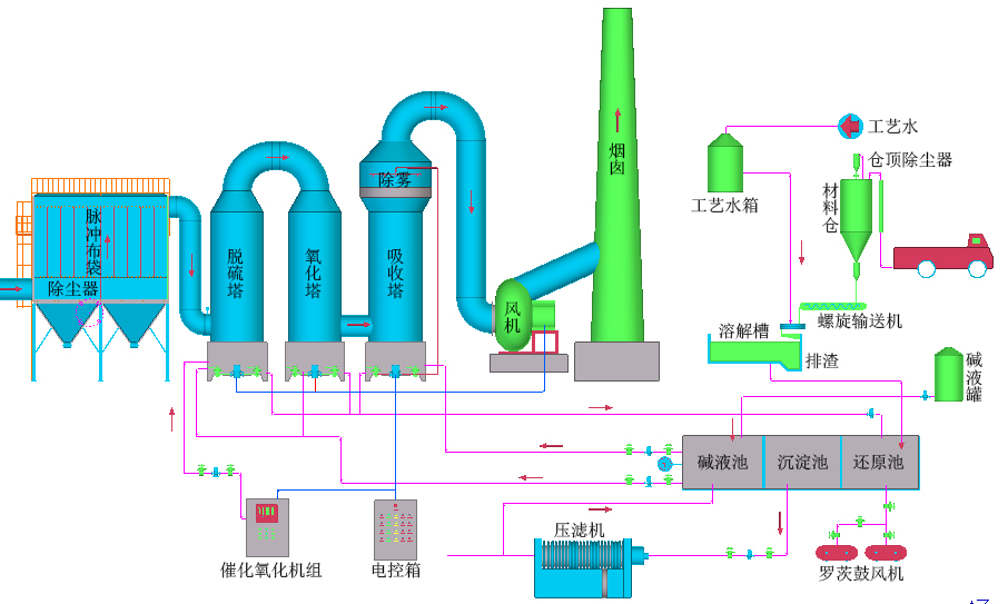 5.副產(chǎn)品可資源化進(jìn)行利用,并產(chǎn)生一定的經(jīng)濟(jì)效益。對(duì)鋼鐵公司是循環(huán)經(jīng)濟(jì),對(duì)貧硫國(guó)家和農(nóng)業(yè)大國(guó)而言,在治理污染的同時(shí)充分回收利用硫資源(濃硫酸、硫酸、硫磺)或生產(chǎn)化肥—硫胺等等均有重要和深遠(yuǎn)的歷史意義和現(xiàn)實(shí)意義。