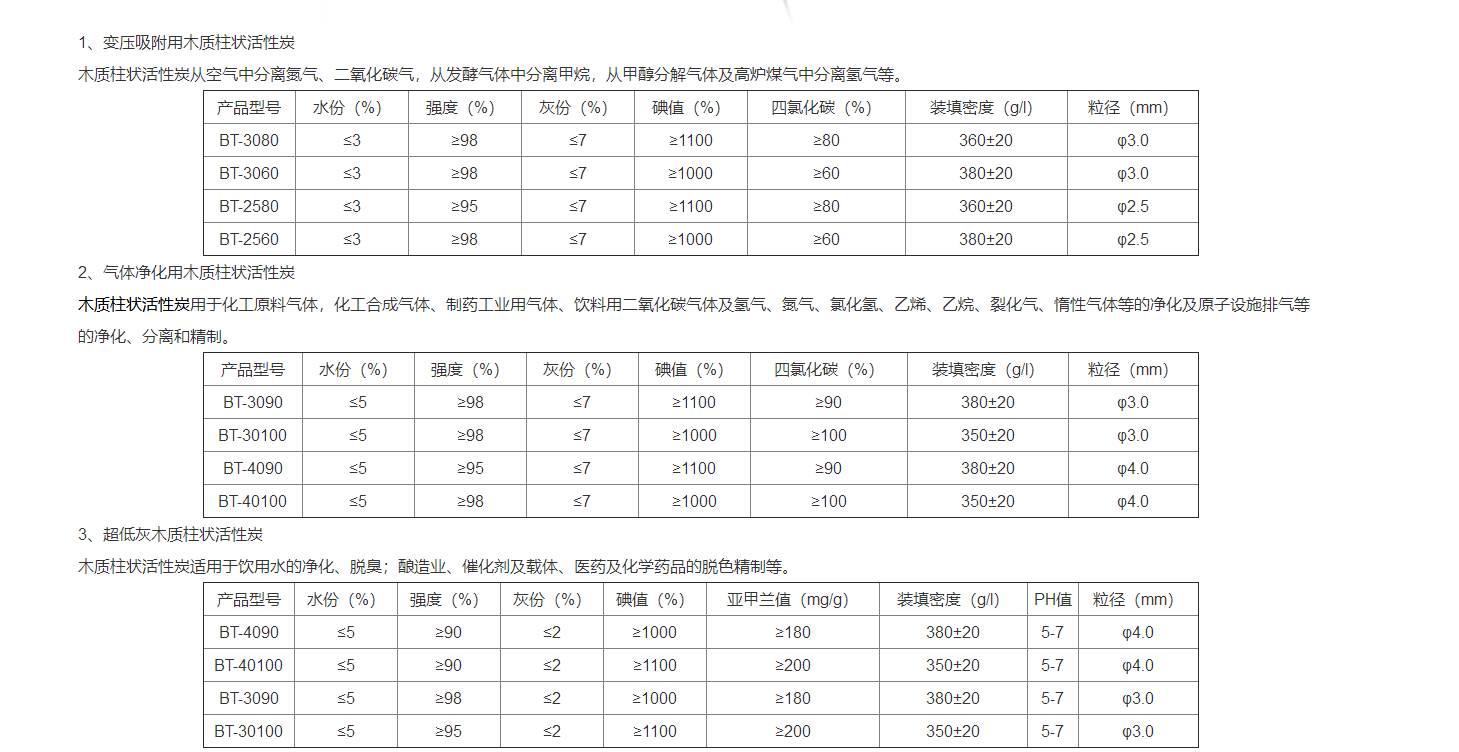 木質(zhì)活性炭主要分為:木質(zhì)柱狀活性炭、木質(zhì)顆?;钚蕴?、木質(zhì)粉狀活性炭。