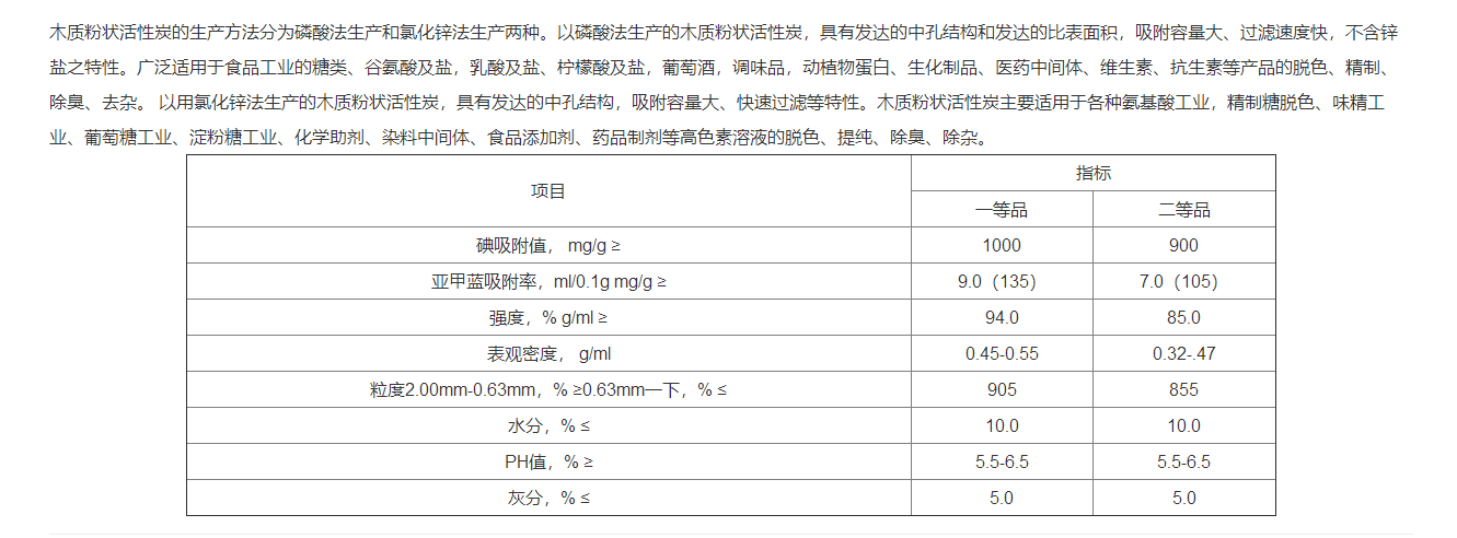 以磷酸法生產(chǎn)的木質(zhì)粉狀活性炭,具有發(fā)達(dá)的中孔結(jié)構(gòu)和發(fā)達(dá)的比表面積,吸附容量大、過濾速度快,不含鋅鹽之特性。廣泛適用于食品工業(yè)的糖類、谷氨酸及鹽,乳酸及鹽、檸檬酸及鹽,葡萄酒,調(diào)味品,動植物蛋白、生化制品、醫(yī)藥中間體、維生素、抗生素等產(chǎn)品的脫色、精制、除臭、去雜。