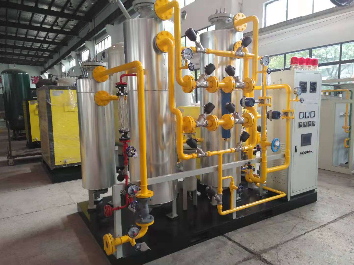 空氣壓縮機壓縮后,除塵、除油、干燥后,進入空氣儲罐,通過空氣進氣閥、左吸氣閥進入左吸附塔,塔壓升高,壓縮空氣中的氧分子被碳分子篩吸附,未吸附氮通過吸附床,通過左吸氣閥、氮氣閥進入氮氣儲罐,稱為左吸,持續(xù)幾十秒。食品小型制氮機。左吸過程結束后,左吸附塔與右吸附塔通過上下均壓閥連接,使兩塔壓力平衡。該過程稱為均壓,持續(xù)時間為2~3秒。均壓后,壓縮空氣通過空氣進氣閥和右吸進氣閥進入右吸附塔。壓縮空氣中的氧分子被碳分子篩吸附,富氮通過右吸出氣閥和氮氣產氣閥進入氮氣儲罐。這個過程叫右吸,持續(xù)幾十秒。同時,左吸附塔中碳分子篩吸附的氧氣通過左排氣閥降壓釋放回大氣中,稱為解吸。相反,左塔吸附時,右塔也在解吸。為了使分子篩中降壓釋放的氧氣完全排放到大氣中,氮氣通過常開的反吹閥吹走吸附塔,將吸附塔中的氧氣吹出吸附塔。這個過程被稱為反吹,它是同時進行的。食品級制氮機。右吸后,進入均壓過程,然后切換到左吸過程,一直循環(huán)。