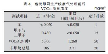 由于包裝印刷生產(chǎn)線VOCs 廢氣的質(zhì)量濃度偏低(<600 mg/m3),需采用沸石轉(zhuǎn)輪- 催化氧化裝置對廢氣進(jìn)行濃縮后再作加熱催化氧化處理。6條生產(chǎn)線入口風(fēng)量Q1=1 5 000 m3/h,每天生產(chǎn)16 h,工作日按330 d/a計算,那么每年排放的VOCs的總量約為:m 總=53.03 mg/m3×15 000 m3/h×5 280 h≈4.2 t/a。經(jīng)沸石轉(zhuǎn)輪- 催化氧化裝置處理前后的廢氣VOCs質(zhì)量濃度見表 4。