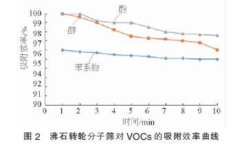 圖2表明,對于包裝印刷行業(yè)廢氣中含有的VOCs物質(zhì)(即苯系物、醇類與酯類物質(zhì)),疏水性分子篩均能進(jìn)行有效吸附。