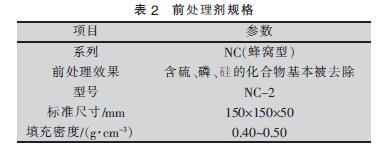 催化氧化分段裝置采用貴金屬Pt 作催化劑,對沸石轉(zhuǎn)輪處理后的高質(zhì)量濃度廢氣進(jìn)行預(yù)熱并將其催化氧化分解。其原理在于借助催化劑降低反應(yīng)活化能, 使得氧化反應(yīng)發(fā)生在較低的起燃溫度(250~400 ℃)。由于待處理廢氣中可能含有使催化劑中毒的物質(zhì)(含硫、磷、硅等元素的化合物),因此需在前端設(shè)置預(yù)處理工序, 即采用陶瓷為載體的前處理劑(見表2)對使催化劑中毒的物質(zhì)進(jìn)行攔截。當(dāng)進(jìn)入催化劑室的高質(zhì)量濃度廢氣溫度較低時, 可通過燃燒器對其進(jìn)行預(yù)熱,使溫度上升至350 ℃;由于該溫度為氧化催化劑最佳活性溫度, 此時VOCs 的處理效率可達(dá)95%以上。